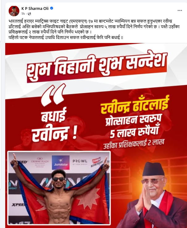 ‘भारतलाई हराएर म्याट्रिक्स फाइट नाइट (एमएफएन) १७ मा बान्टमवेट च्याम्पियन बन्न सफल हुनुभएका रवीन्द्र ढाँटलाई अस्ति बसेको मन्त्रिपरिषदको बैठकले प्रोत्साहन स्वरुप ५ लाख रुपैयाँ दिने निर्णय गरेको छ । यस्तै उहाँका प्रशिक्षकलाई २ लाख रुपैयाँ दिने पनि निर्णय भएको छ ।’ सामाजिक सञ्जालमार्फत प्रधानमन्त्री ओलीले भन्नुभएकाे छ, ‘पहिलो पटक नेपाललाई उपाधि दिलाउन सफल रवीन्द्रलाई फेरि पनि बधाई !!’