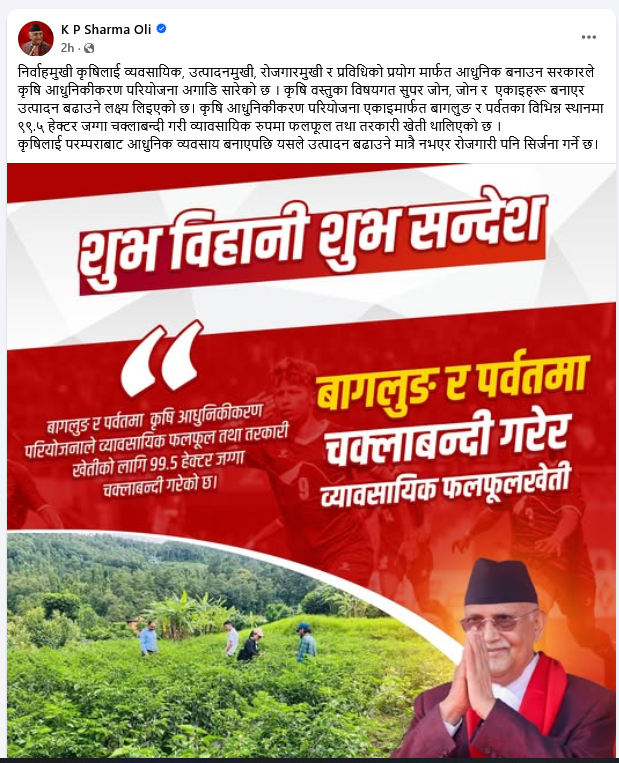 ‘निर्वाहमुखी कृषिलाई व्यावसायिक, उत्पादनमुखी, रोजगारमुखी र प्रविधिको प्रयोगमार्फत आधुनिक बनाउन सरकारले कृषि आधुनिकीकरण परियोजना अगाडि सारेको छ। कृषि वस्तुका विषयगत सुपर जोन, जोन र एकाइहरू बनाएर उत्पादन बढाउने लक्ष्य लिइएको छ’, प्रधानमन्त्री ओलीले सामाजिक सञ्जालमा लेख्नुभएको छ।