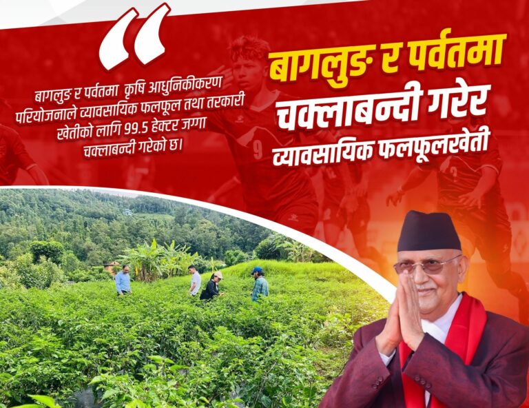 यसैगरी कृषि आधुनिकीकरण परियोजना एकाइमार्फत बागलुङ र पर्वतका विभिन्न स्थानमा ९९.५ हेक्टर जग्गा चक्लाबन्दी गरी व्यावसायिक रूपमा फलफूल तथा तरकारी खेती थालिएको पनि प्रधानमन्त्री ओलीले जानकारी दिनुभएको छ।