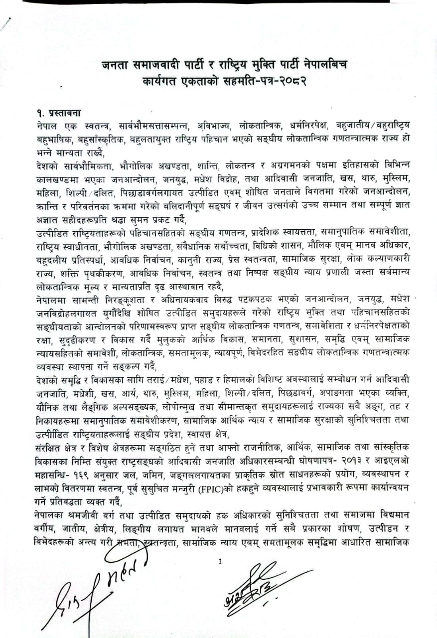 बिहीबार काठमाडौंमा आयोजित एक कार्यक्रमकाबीच जसपाको तर्फबाट अध्यक्ष अशोक राई र राष्ट्रिय मुक्ति पार्टी नेपालको तर्फबाट अध्यक्ष राजेन्द्र महतोले कार्यगत एकताको घोषणा गर्दै हस्ताक्षर गर्नुभएको हाे।