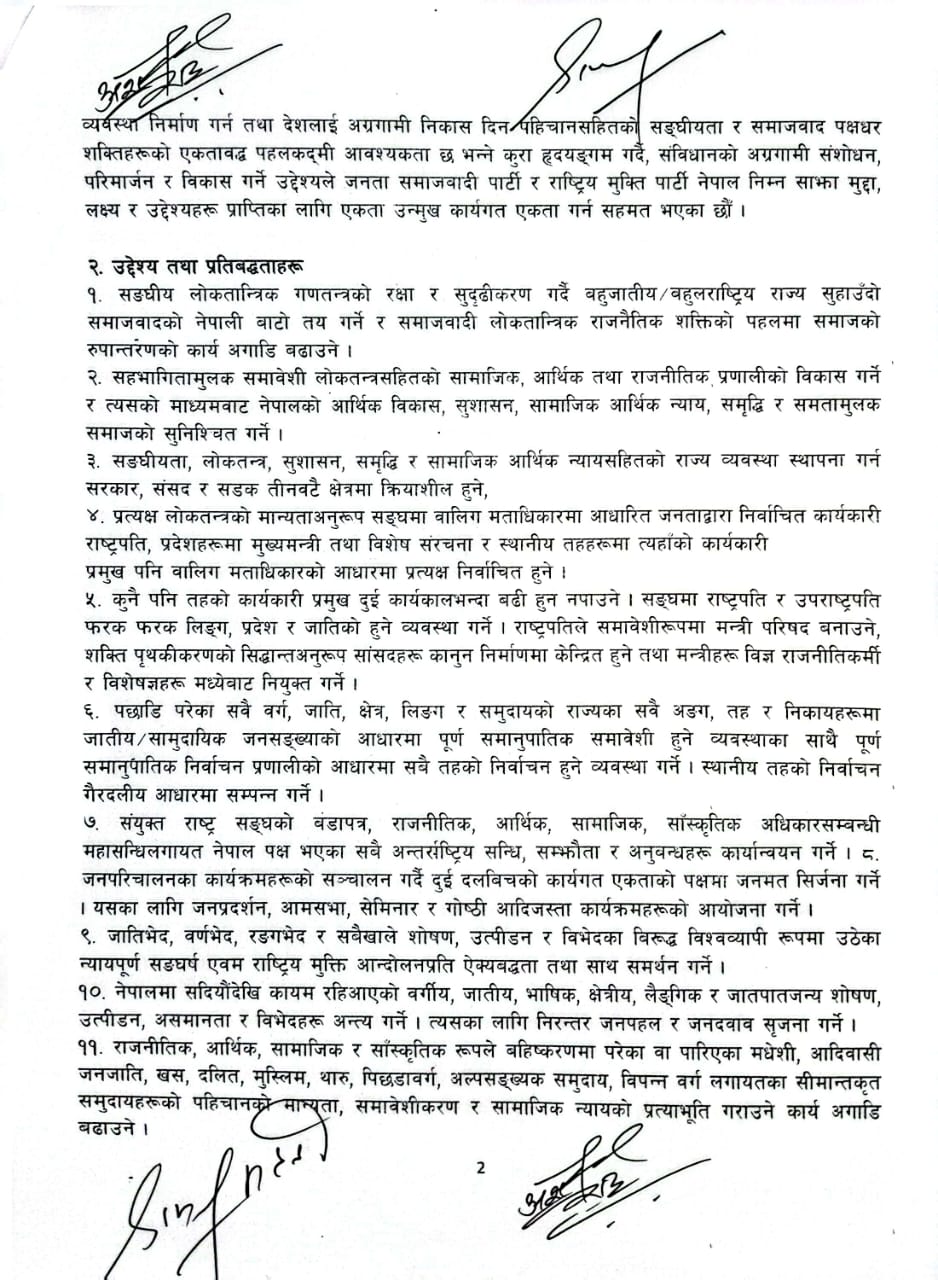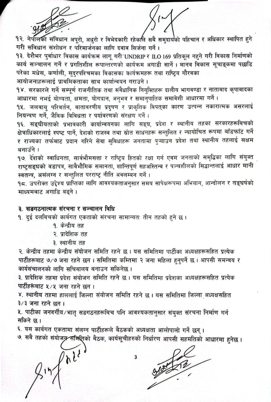 दुई पार्टीका अध्यक्षले हस्ताक्षर गरेको सहमति पत्रमा ८ बुँदे आचारसंहिता नै उल्लेख छ। दुई दलबीचको केन्द्रीय संयोजन समितिले पारित गरी जारी गरेका निर्देशनहरू तथा प्रदेश र जिल्ला संयोजन समितिहरूले गरेका निर्णयहरू दुबै दलले पालना गर्नुपर्ने, संयुक्त रूपमा गरिने सार्वजनिक कार्यक्रमहरूमा दुई दलबीचको कार्यगत एकताको उद्देश्य, नीति र कार्यक्रमको आधारमा आफ्नो मन्तव्य दिनुपर्ने उल्लेख छ।