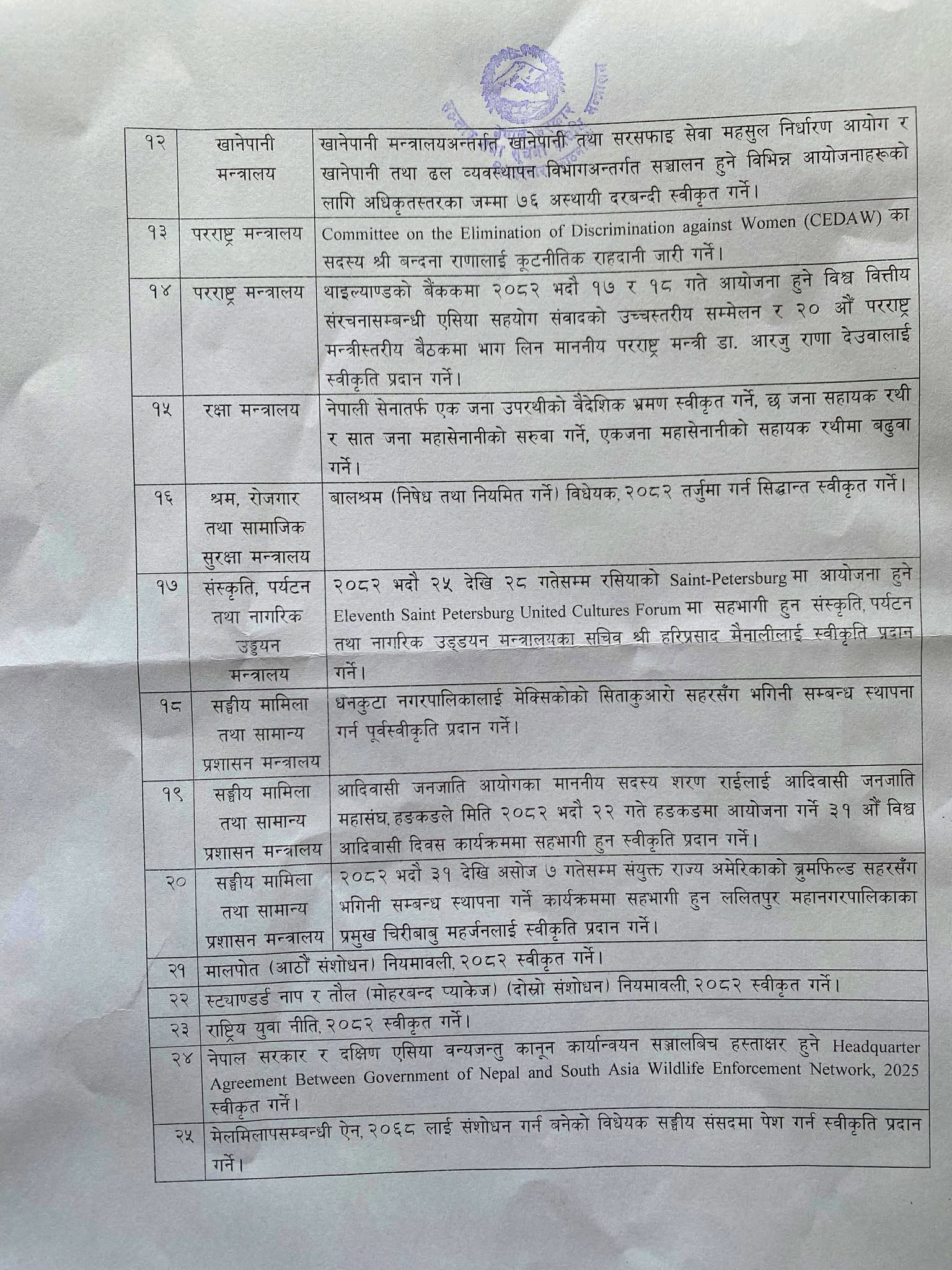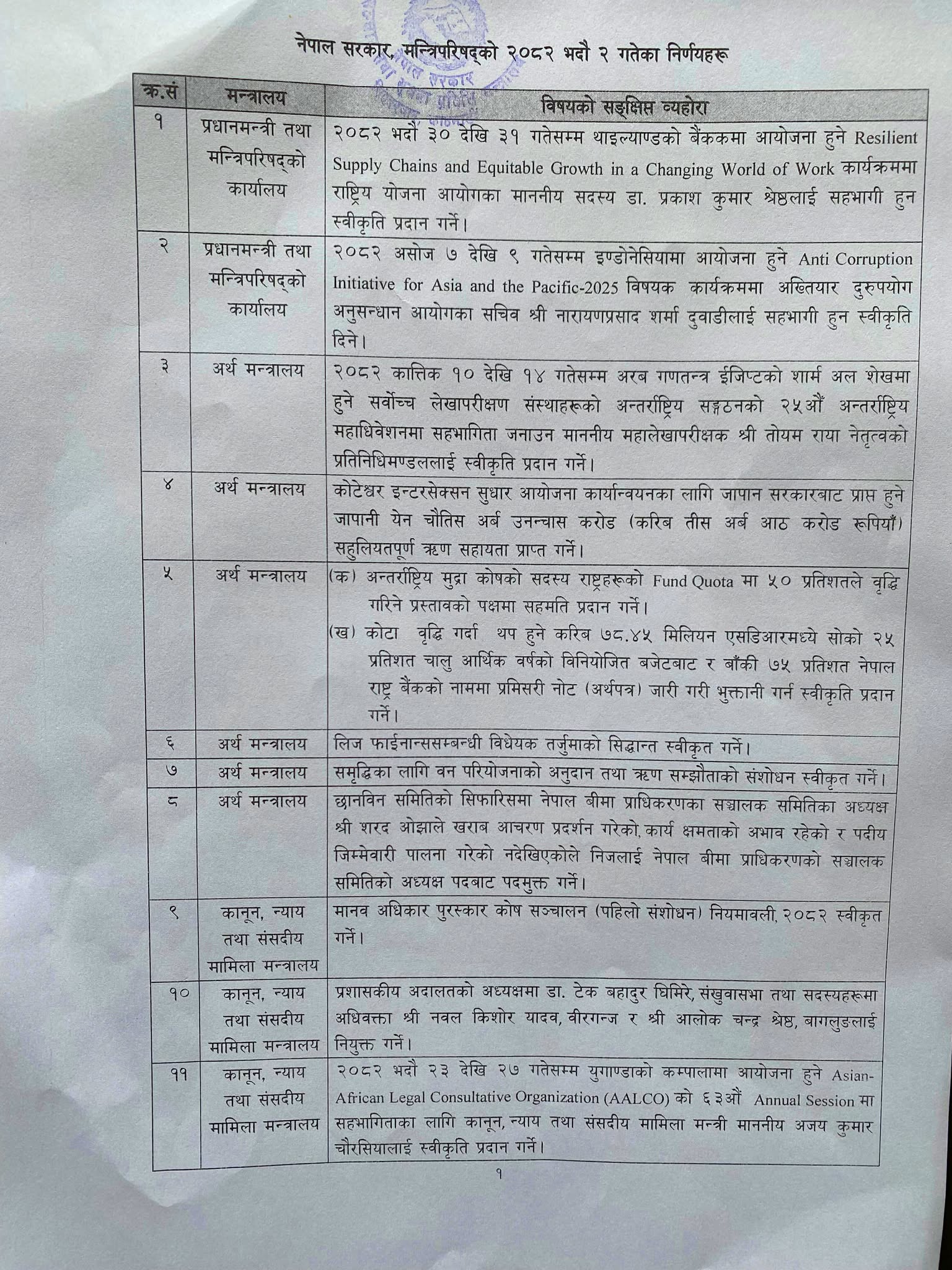 त्यस्तै, आगामी भदौ ३० देखि ३१ गतेसम्म थाइल्याण्डको बैंककमा आयोजना हुने रिजिलियन्ट सप्लाइ चेइन्स, एन्ड इक्युटेवल ग्रोथ इन अ चेन्जीङ वर्ल्ड अफ वर्क कार्यक्रममा राष्ट्रिय योजना आयोगका सदस्य डा. प्रकाश कुमार श्रेष्ठलाई सहभागी हुन स्वीकृति प्रदान गर्ने, आगामी असोज ७ देखि ९ गतेसम्म इण्डोनेसियामा आयोजना हुने एन्टी क्रप्सन इनिसिएटीभ फर एसिया एन्ड द पेसिफीक–२०२५ विषयक कार्यक्रममा अख्तियार दुरुपयोग अनुसन्धान आयोगका सचिव नारायणप्रसाद शर्मा दुवाडीलाई सहभागी हुन स्वीकृति दिने सरकारको निर्णय छ।