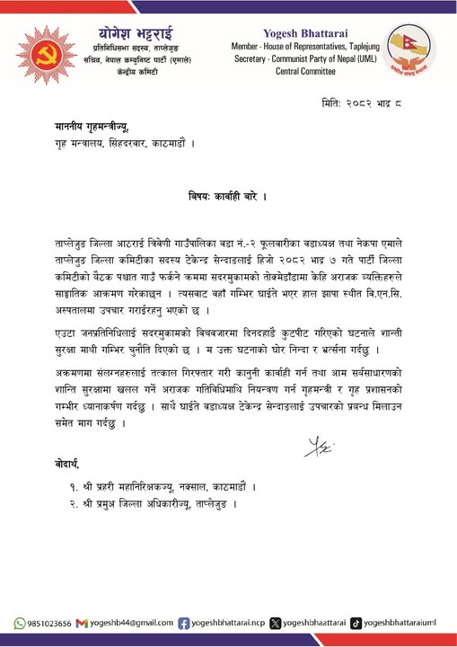 काठमाडौँ-नेकपा एमालेका सचिव तथा ताप्लेजुङका सांसद योगेश भट्टराईले ताप्लेजुङको आठराई गाउँपालिका वडा-२ का वडाध्यक्ष टेकेन्द्र सेन्दाङमाथि आक्रमण गर्नेलाई कारबाही गर्न माग गर्नुभएको छ।
