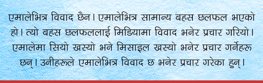एमालेभित्रको वास्तविकता के हो भने एमालेभित्र विवाद छैन। एमालेभित्र सामान्य बहस छलफल भएको हो। त्यो बहस छलफललाई मिडियामा विवाद भनेर प्रचार गरियो। एमालेमा सियो खस्यो भने मिसाइल खस्यो भनेर प्रचार गर्नेहरू छन्। उनीहरूले एमालेभित्र विवाद छ भनेर प्रचार गरेका हुन्।