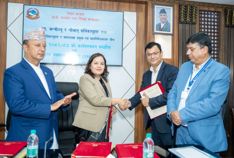 ऊर्जा, जलस्रोत तथा सिँचाइ मन्त्री दीपक खड्का र मन्त्रालय अन्तर्गतका तीन सचिवबीच सहित सचिव र महानिर्देशबीचमा आज मन्त्रालयमा सो सम्झौता भएको हो। ऊर्जा मन्त्रालयमा आज भएको कार्यक्रममा मन्त्री खड्कासंग ऊर्जा सचिव सुरेश आचार्य, जलस्रोत तथा सिँचाइ सचिव सरीता दवाडी र जल तथा ऊर्जा आयोगको सचिवालयका सचिव दिनानाथ मिश्रबीच सम्झौता भएको हो।