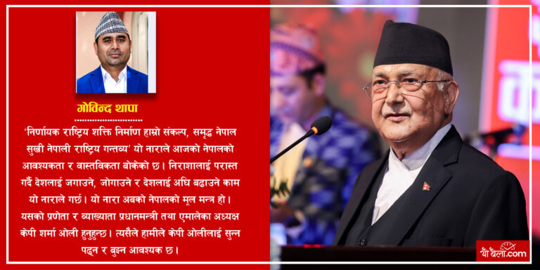 ‘निर्णायक राष्ट्रिय शक्ति निर्माण हाम्रो संकल्प, समृद्ध नेपाल सुखी नेपाली राष्ट्रिय गन्तव्य’ यो नाराले आजको नेपालको आवश्यकता र वास्तविकता बोकेको छ। यो नारा पछाडिको दर्शन र विचार के-के छ ? यसको प्रणेता र व्याख्याता नेकपा एमालेका अध्यक्ष केपी शर्मा ओली हुनुहुन्छ। केही वर्ष अघिदेखिका उहाँका लेख, भाषण, अन्तर्वार्ताहरुमा यो विचार र दर्शनको धेरै पक्ष उजागर भइसकेको छ । त्यसैले हामीले केपी ओलीलाई सुन्न पढ्न र बुझ्न आवश्यक छ।