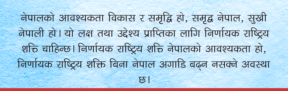 निर्णायक राष्ट्रिय शक्ति निर्माण देशको आवश्यकता हो। नेपालको अविकासको एउटा मुख्य कारण राजनीतिक अस्थिरता हो । राजनीतिक अस्थिरता भनेको क्यान्सर जस्तो हो, क्यान्सरले शरीरलाई भित्रभित्रै गलाए जस्तै राजनीतिक अस्थिरताले देशलाई गलाउँछ। निर्णायक राष्ट्रिय शक्ति निर्माणको आवश्यकता धेरै कारणले परेको देखिन्छ। नेपालको आवश्यकता विकास र समृद्धि हो, समृद्ध नेपाल, सुखी नेपाली हो। यो लक्ष तथा उद्देश्य प्राप्तिका लागि निर्णायक राष्ट्रिय शक्ति चाहिन्छ। निर्णायक राष्ट्रिय शक्ति नेपालको आवश्यकता हो, निर्णायक राष्ट्रिय शक्ति बिना नेपाल अगाडि बढ्न नसक्ने अवस्था छ।