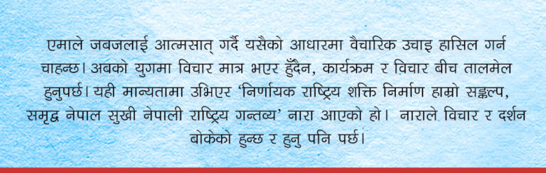 नाराले विचार र दर्शन बोकेको हुन्छ र हुनु पनि पर्छ। अब ‘निर्णायक राष्ट्रिय शक्ति निर्माण हाम्रो संकल्प, समृद्ध नेपाल सुखी नेपाली राष्ट्रिय गन्तव्य’ नाराले बोकेको विचार दर्शनको बारेमा म संक्षिप्तमा चर्चा गर्छु।
