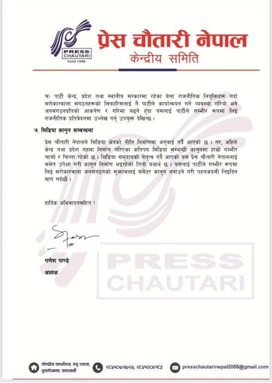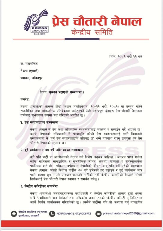 प्रेस चौतारी नेपालले मिडिया क्षेत्रको नीति निर्माणमा अगुवाई गर्दै आएको छ। तर, अहिले केन्द्र तथा प्रदेश तहमा निर्माण गरिएका कतिपय मिडिया सम्बन्धी कान्नमा हाम्रो गम्भीर चासो र चिन्ता रहेको छ। मिडिया समुदायको नेतृत्व गर्दै आएको यस प्रेस चौतारी नेपाललाई समेत उपेक्षा गरी कानुन निर्माण भइरहेको तितो यथार्थ छ । यसलाई पार्टीले गम्भीर रूपमा लिई सरोकारवाला जनसंगठनको सुझावलाई समेटर कानुन बनाउने गरी पहलकदमी लिइदिन माग गर्दछौं।