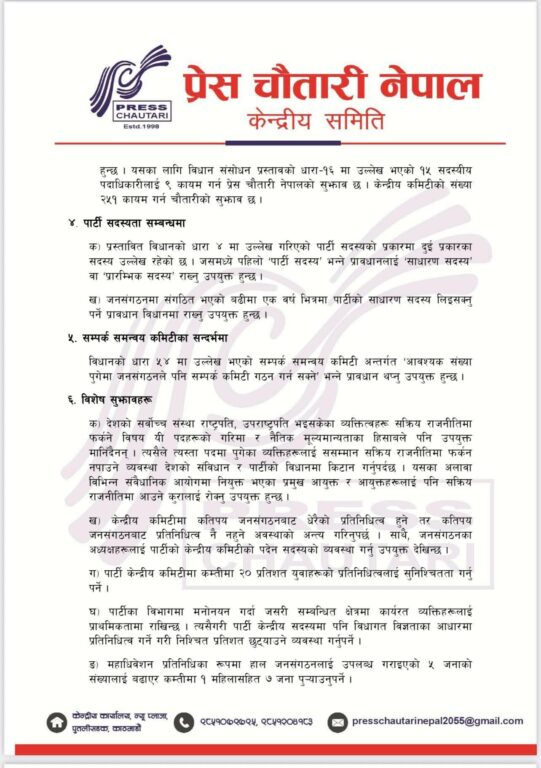 हुन्छ । यसका लागि विधान संसोधन प्रस्तावको धारा-१६ मा उल्लेख भएको १५ सदस्यीय पदाधिकारीलाई ९ कायम गर्न प्रेस चौतारी नेपालको सुझाव छ। केन्द्रीय कमिटीको संख्या २५१ कायम गर्न चौतारीको सुझाव छ।