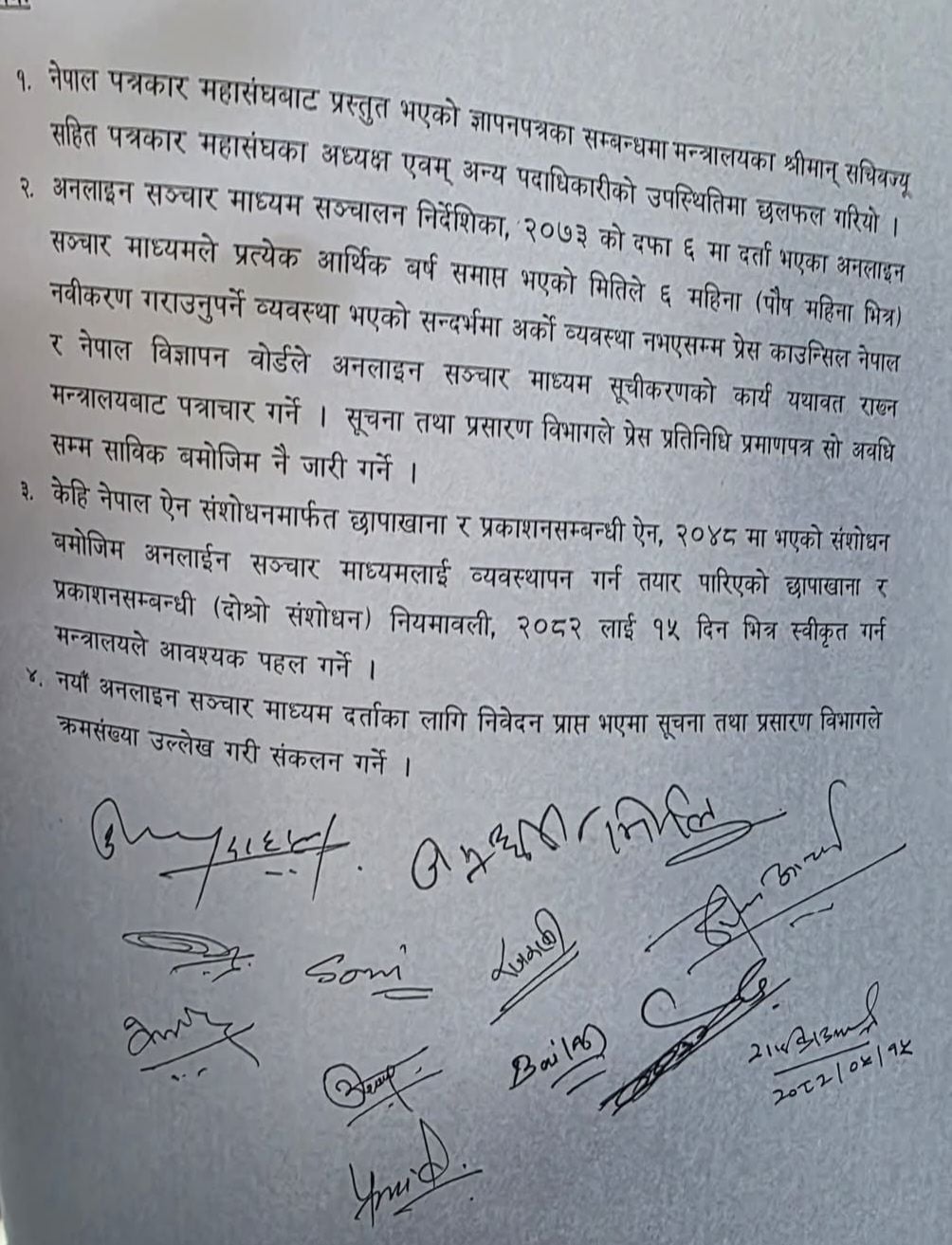 नेपाल पत्रकार महासंघले ध्यानाकर्षण गराइसकेपछि मन्त्रालयका सचिव तथा महासंघका अध्यक्षसहित पदाधिकारीको उपस्थितिमा सहमति भएको हो।
