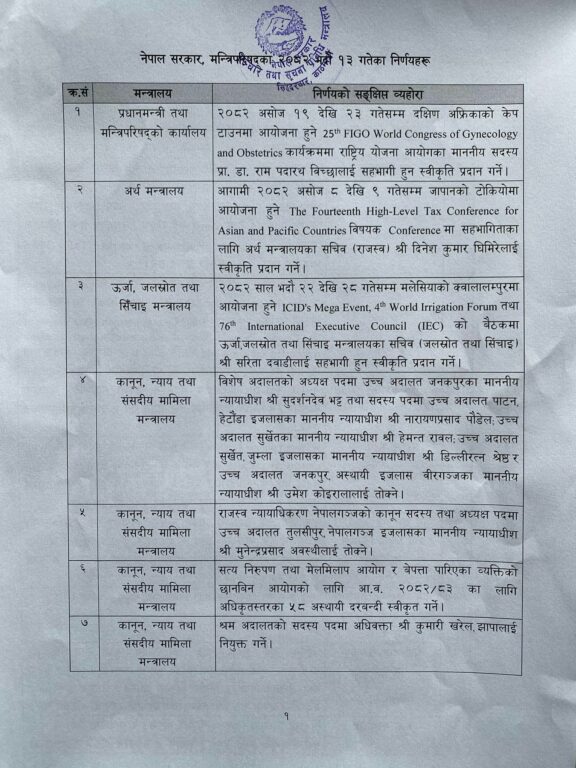 यस्तै सत्य निरूपण तथा मेलमिलाप आयोग र बेपत्ता पारिएका व्यक्तिको छानबिन आयोगका लागि अस्थायी दरबन्दी स्वीकृति गर्ने, श्रम अदालतको सदस्य पदमा अधिवक्ता कुमारी खरेललाई नियुक्त गर्नेसहितका निर्णय भएको गुरुङले जानकारी दिनुभयाे।