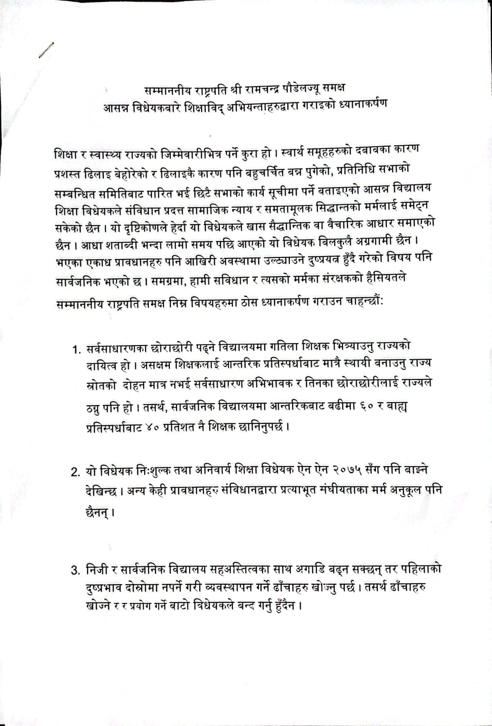 शिक्षाकर्मीहरूले राष्ट्रपतिलाई बुझाएको ध्यानाकर्षण पत्रमा भनेका छन्, ‘यो दृष्टिकोणले हेर्दा यो विधेयकले खास सैद्धान्तिक वा वैचारिक आधार समाएको छैन। आधा शताब्दी भन्दा लामो समयपछि आएको यो विधेयक बिलकुलै अग्रगामी छैन। भएका एकाध प्रावधानहरू पनि आखिरी अवस्थामा उल्ट्याउने दुष्प्रयत्न हुँदै गरेको विषय पनि सार्वजनिक भएको छ। समग्रमा हामी सविधान र त्यसको मर्मका संरक्षकको हैसियतले सम्माननीय राष्ट्रपति समक्ष निम्न विषयहरूमा ठोस ध्यानाकर्षण गराउन चाहन्छौं ।’