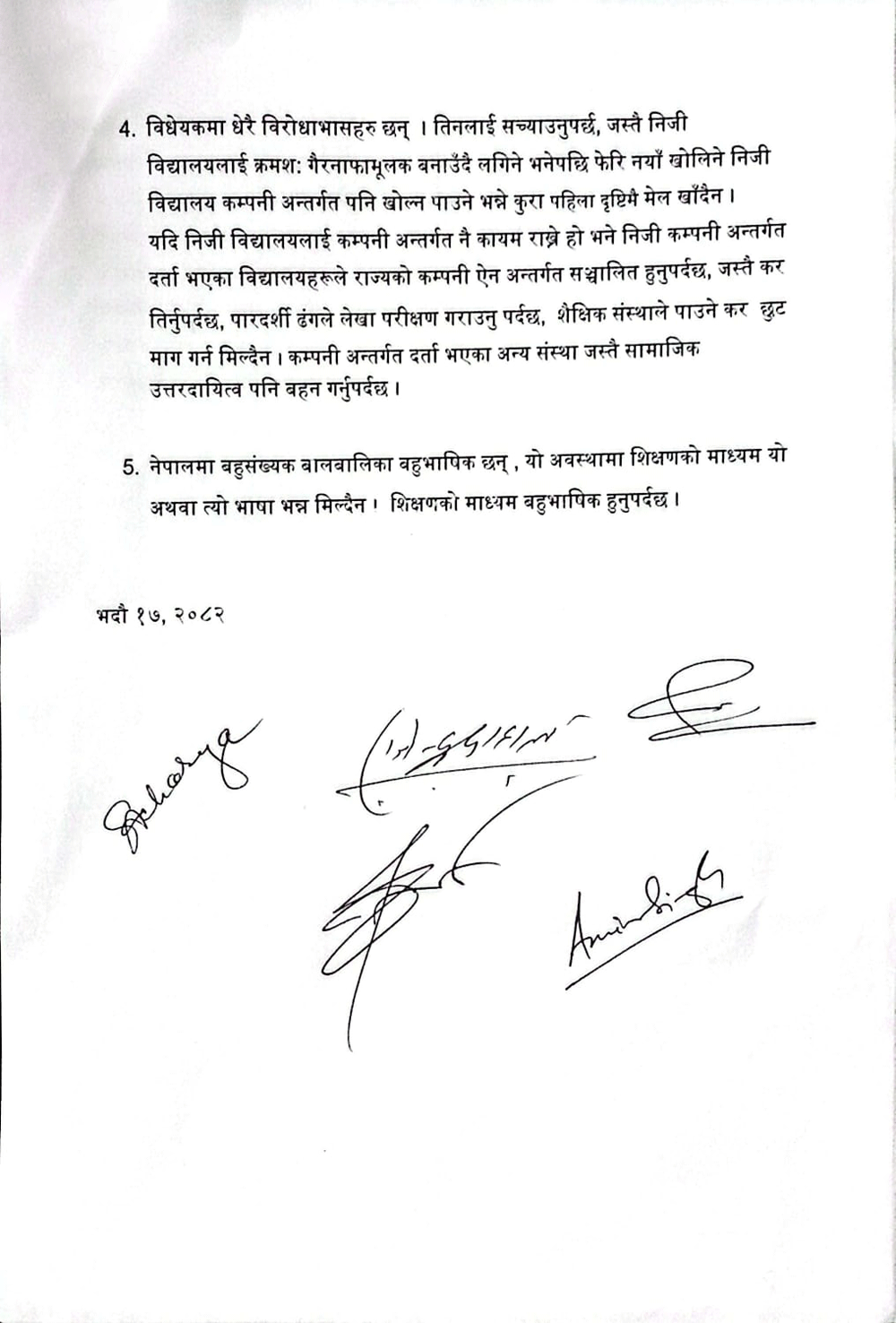 ३. निजी र सार्वजनिक विद्यालय सहअस्तित्वका साथ अगाडि बढ्न सक्छन् तर पहिलाको दुष्प्रभाव दोस्रोमा नपर्ने गरी व्यवस्थापन गर्ने ढाँचाहरू खोज्नुपर्छ। तसर्थ, ढाँचाहरू खोज्ने र र प्रयोग गर्ने बाटो विधेयकले बन्द गर्नु हुँदैन।