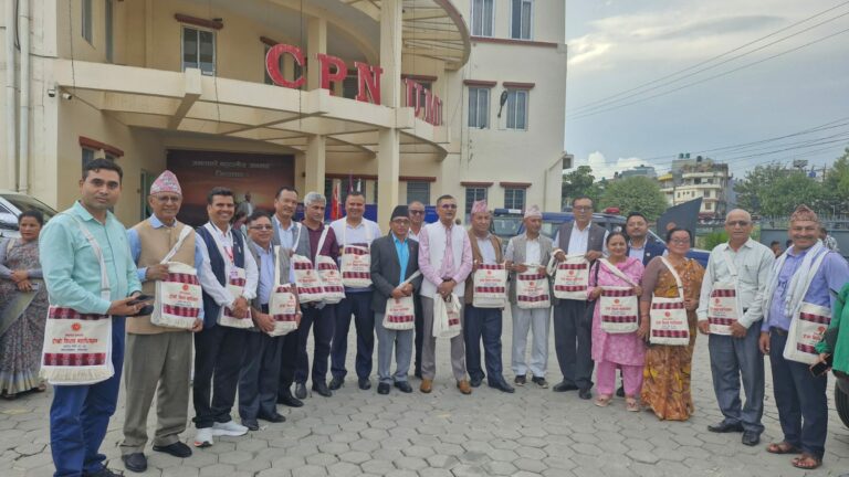 बाँयातिर नेकपाका संस्थापक महासचिव पुष्पलाल, पूर्वमहासचिव मदन भण्डारी र पूर्वप्रधानमन्त्री मनमोहन अधिकारीको पूर्णकदको तस्विर राखिएको छ। पश्चिमतिर कार्लमाक्र्स, एङ्ेल्स र लेनिनको पूर्ण कदसहित तस्विर राखिएको छ । हलभित्र २२ सय स्क्वार फिट डिजिटल बोर्ड राखिएको छ।