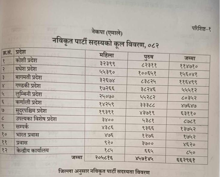 काठमाडौं– नेकपा (एमाले)को पछिल्लो नविकृत पार्टी सदस्यहरु ६ लाख ६२ हजार ९ सय ६१ जना रहेका छन्। यो संगठित पार्टी सदस्य संख्या १० औं महाधिवेशन पछि ३० प्रतिशतले बृद्धि भएको हो।
