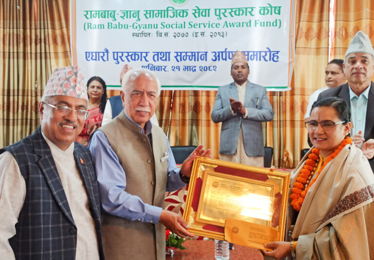 काठमाडौँ- यसवर्षको ‘रामबाबु-ज्ञानु सामाजिक सेवा पुरस्कार’ मानव कल्याण समाज (सेवा घर)लाई प्रदान गरिएको छ । रामबाबु–ज्ञानु सामाजिक सेवा पुरस्कार कोषले आज यहाँ आयोजना गरेको कार्यक्रममा त्रिभुवन विश्वविद्यालयका पूर्वउपकुलपति केदारभक्त माथेमाले समाजका संस्थापक सुमित्रा चौलागाई (सुमी मानव)लाई पुरस्कार प्रदान गर्नुभयो ।