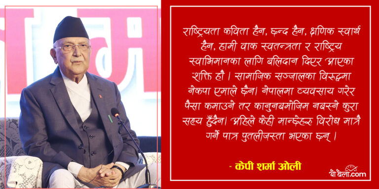 ‘राष्ट्रियता कविता हैन, छन्द हैन, क्षणिक स्वार्थ हैन, हामी वाक स्वतन्त्रता र राष्ट्रिय स्वाभिमानका लागि बलिदान दिएर आएका शक्ति हौँ, सामाजिक सञ्जालका विरुद्धमा नेकपा एमाले छैन, नेपालमा व्यवसाय गरेर पैसा कमाउने तर कानुनबमोजिम नबस्ने कुरा सह्य हुँदैन। अहिले केही मान्छेहरु विरोधमात्रै गर्ने पात्र पुतलीजस्ता भएका छन्’, प्रधानमन्त्री ओलीले भन्नुभयो।