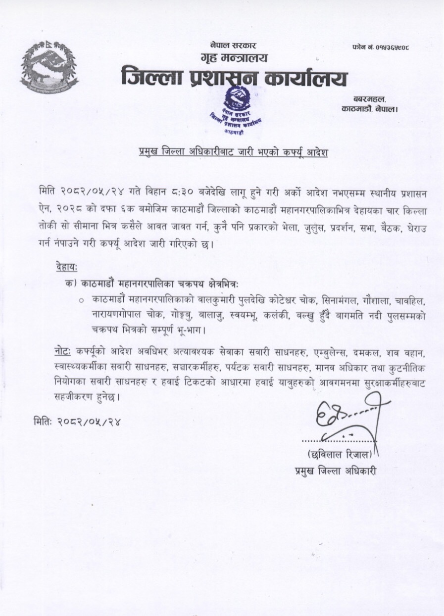 प्रमुख जिल्ला अधिकारीको आदेशमा आज बिहान ८ बजेदेखि लागू हुनेगरी काठमाडौं महानगरपालिकाको बालकुमारी पुलदेखि कोटेश्वर चोक, सिनामंगल, गौशाला, चाबहिल, नारायणगोपाल चोक, गोङ्गबु, बालाजु, स्वयम्भू, कलंकी, बल्खु हुँदै वागमति नदी पुलसम्मको चक्रपथ भित्रको सम्पूर्ण भू-भागमा कर्फ्यू आदेश जारी गरिएकाे हाे ।
