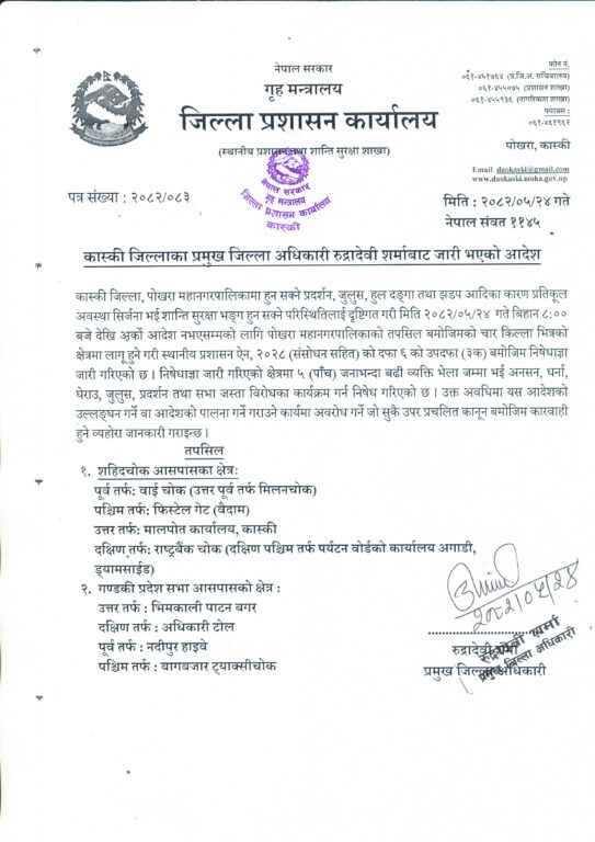 गण्डकी-कास्की जिल्ला प्रशासन कार्यालयले आज बिहान ८ बजेदेखि अर्को आदेश नभएसम्मका लागि जनाउँदै जिल्लाका विभिन्न स्थानमा निषेधाज्ञा जारी गरेको छ।