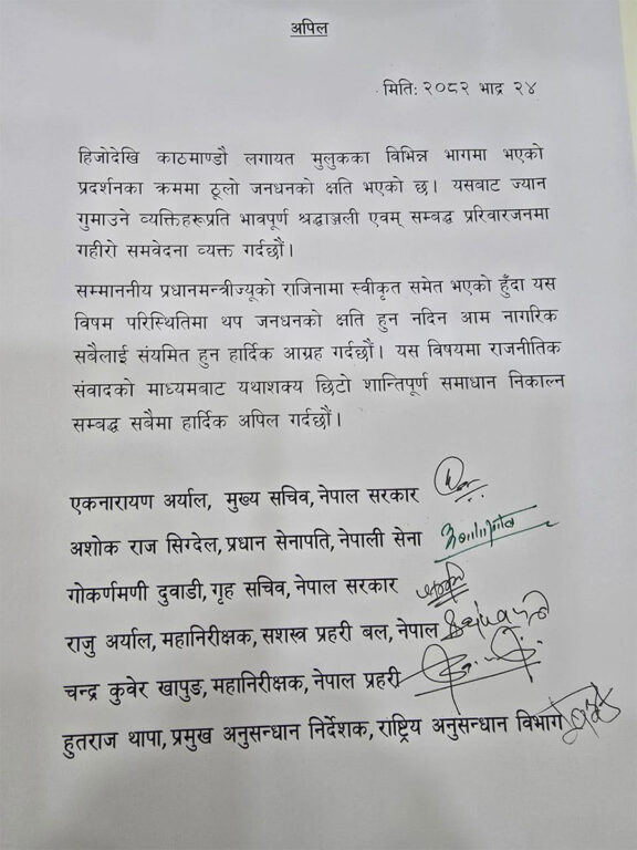 मुख्यसचिव एकनारायण अर्याल, प्रधान सेनापति अशोकराज सिग्देल, गृहसचिव गोकर्णमणी दुवाडि, एपीएफका आईजीपी राजु अर्याल, नेपाल प्रहरीका आईजीपी चन्द्रकुवेर खापुङ र राष्ट्रिय अनुसन्धान विभाग प्रमुख हुतराज थापाले उक्त अपिल गरेका हुन् ।