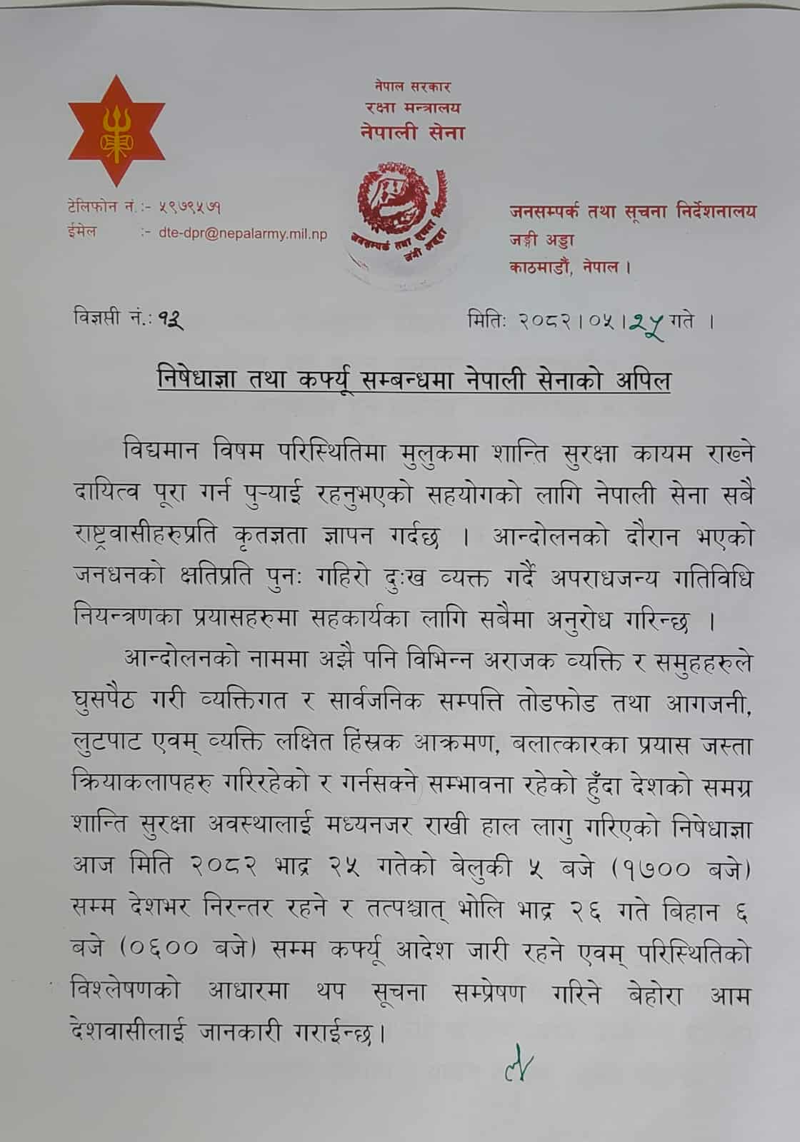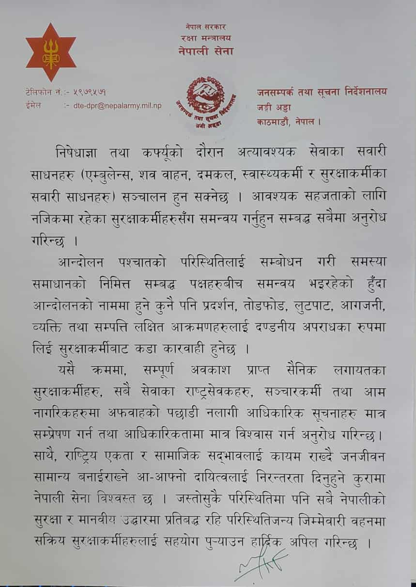 सैनिक जनसम्पर्क निर्देशनालयले बुधबार जारी गरेको विज्ञप्तिमा उल्लेख छ, ‘आन्दोलनका नाममा अझै पनि विभिन्न अराजक व्यक्ति र समूहले घुसपैठ गरी व्यक्तिगत र सार्वजनिक सम्पत्ति तोडफोड तथा आगजनी, लुटपाट एवम् व्यक्ति लक्षित हिंस्रक आक्रमण, बलात्कारका प्रयासजस्ता क्रियाकलाप गरिरहेको र गर्नसक्ने सम्भावना रहेको हुँदा देशको समग्र शान्ति सुरक्षा अवस्थालाई दृष्टिगत राखी हाल लागू गरिएको निषेधाज्ञा आज मिति २०८२ भाद्र २५ गतेको बेलुकी ५ बजे बजेसम्म देशभर निरन्तर रहने र तत्पश्चात् भोलि भाद्र २६ गते बिहान ६ बजेसम्म कर्फ्यु आदेश जारी रहने एवम् परिस्थितिको विश्लेषणका आधारमा थप सूचना सम्प्रेषण गरिने बेहोरा आम देशवासीलाई जानकारी गराइन्छ ।’