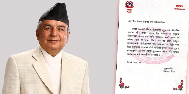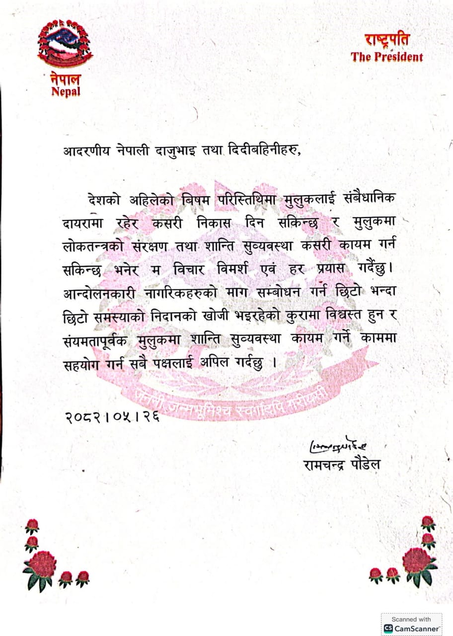 ‘देशको अहिलेको परिस्थितीमा मुलुकलाई संबैधानिक दायरामा रहेर कसरी निकास दिन सकिन्छ र मुलुकमा लोकतन्त्रको संरक्षण तथा शान्ती सुव्यवस्था कसरी कायम गर्न सकिन्छ भनेर म बिचार विर्मश एवं हर प्रयास गर्दैछु ’ राष्ट्रपति पौडेलको विज्ञप्तीमा लेखिएको छ ‘आन्दोलनकारी नागरिकको माग सम्बोधन गर्न छिटो भन्दा छिटो समस्याको निदानको खोजी भइरहेको कुरामा विश्वश्त हुन र संयमतापूर्वक मुलुकमा शान्ती सुव्यवस्था कायम गर्ने काममा सहयोग गर्न सबै पक्षलाई अपिल गर्दछु ।’