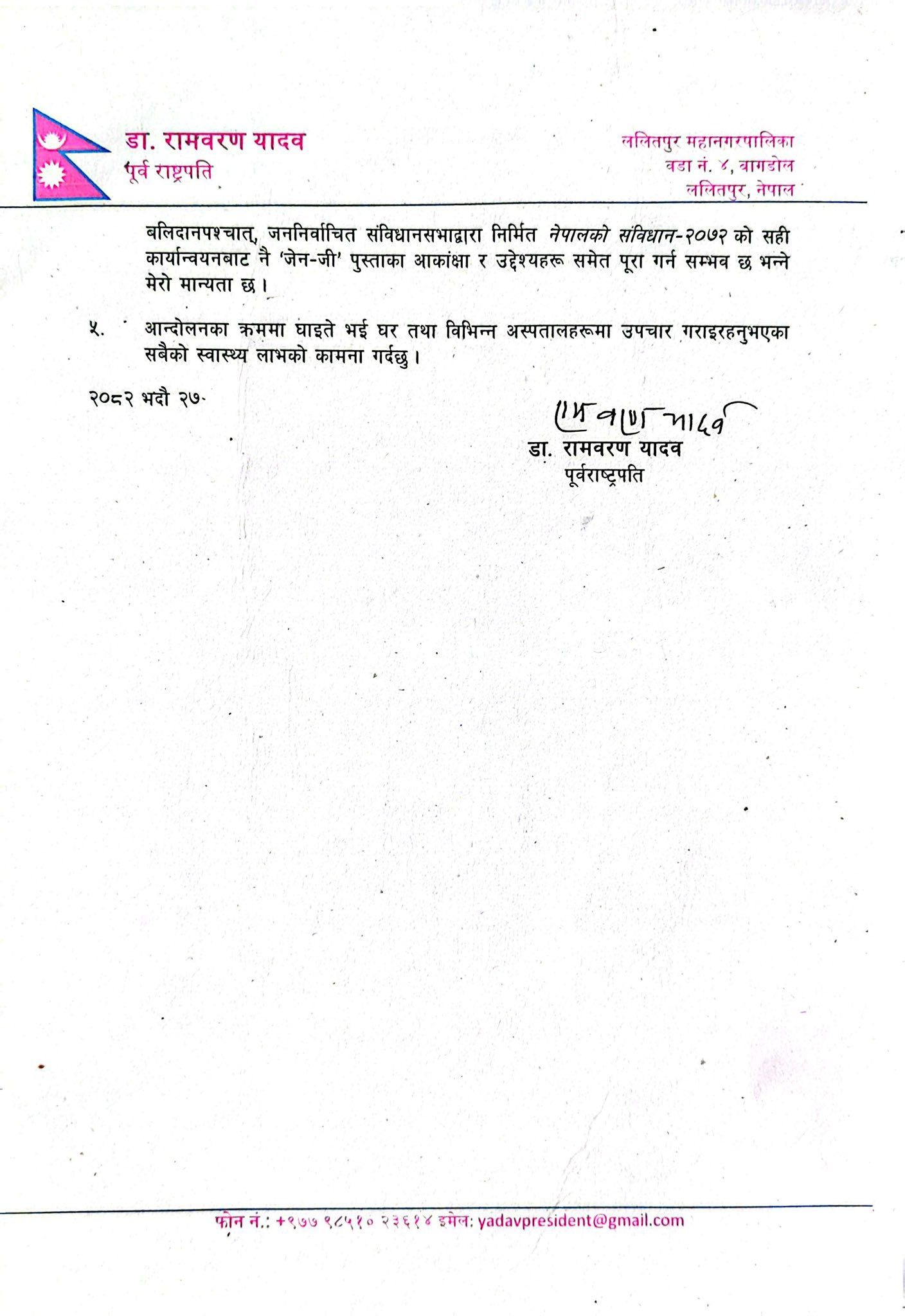 पूर्वराष्ट्रपति यादवले विज्ञप्तिमा भनेका छन्, ‘यस आन्दोलनका क्रममा लाखौं नेपालीलाई रोजगारी दिने अनि राज्यलाई अर्बौं रुपैयाँ राजस्व तिरेर मुलुक र समाजको आर्थिक समृद्धिमा ठुलो योगदान गरिरहेका मूल्यवान औद्योगिक एवं व्यावसायिक प्रतिष्ठानहरूमा भएको तोडफोड र आगजनीले देशको अर्थतन्त्रमा दूरगामी धक्का पुर्याएको छ। यस्तो घातक प्रवृत्तिबाट भविष्यमा मुलुकलाई जोगाउनका निम्ति यसलाई गम्भीरतापूर्वक लिन म सबैलाई अपील गर्दछु।’