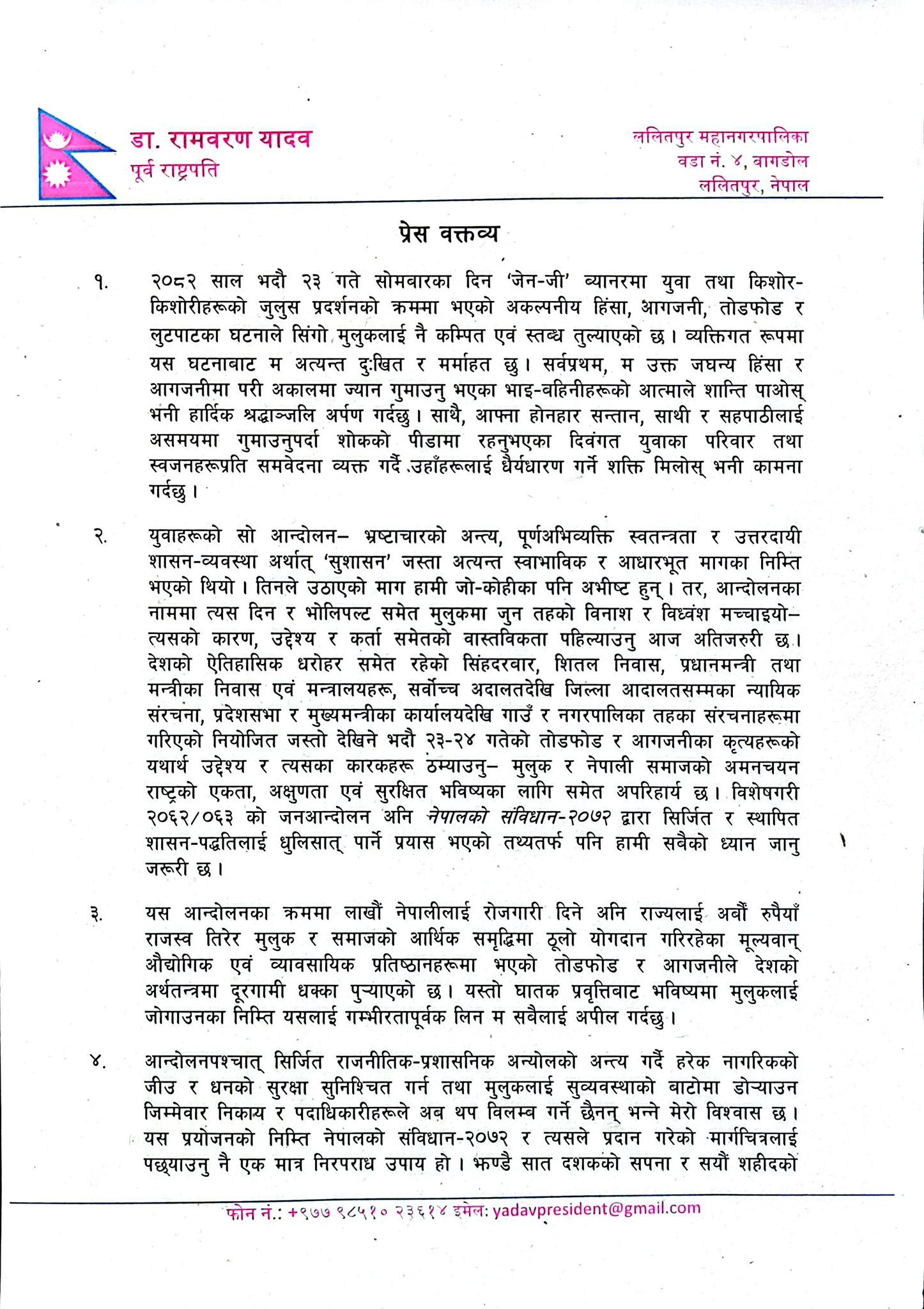 आज अर्थात् शुक्रवार दिउँसो पूर्वराष्ट्रपति यादवले प्रेस वक्तव्य जारी गर्दै २०८२ भदौ २३ गते सोमबार ‘जेनजी’ ब्यानरमा युवा तथा किशोर-किशोरीहरूको जुलुस प्रदर्शनको क्रममा भएको अकल्पनीय हिंसा, आगजनी, तोडफोड र लुटपाटका घटनाले सिंगो मुलुकलाई नै कम्पित एवं स्तब्ध तुल्याएको उल्लेख गरेका छन्। यस घटनाबाट व्यक्तिगत रूपमा आफू अत्यन्त दुःखी र मर्माहत भएको पूर्व राष्ट्रपति डा. यादवले जनाउनु भएकाे छ।