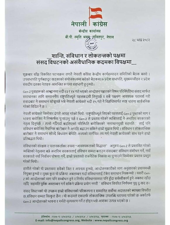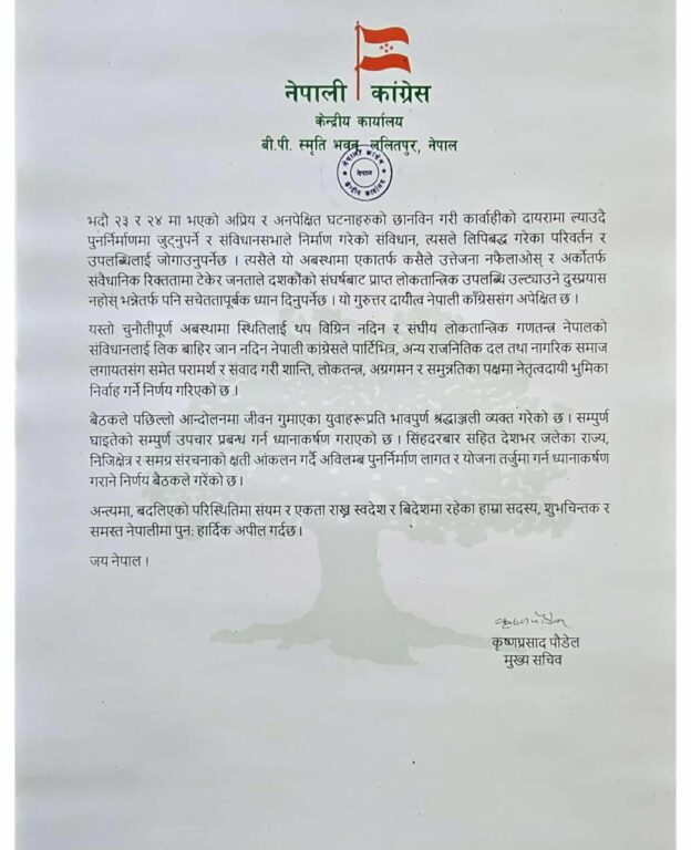 कांग्रेसले भदौ २३ र २४ मा भएको अप्रिय तथा अनपेक्षित घटनाहरुको छानविन गरी कार्वाहीको दायरामा ल्याउँदै पुनर्निर्माणमा जुट्नुपर्ने र संविधानसभाले निर्माण गरेको संविधान, त्यसले लिपिबद्ध गरेका परिवर्तन र उपलब्धिलाई जोगाउनुपर्ने आग्रह गरेको छ । “त्यसैले यो अवस्थामा एकातर्फ कसैले उत्तेजना नफैलाओस् र अर्कोतर्फ संवैधानिक रिक्ततामा टेकेर जनताले दशकौँको सङ्घर्षबाट प्राप्त लोकतान्त्रिक उपलब्धि उल्ट्याउने दुस्प्रयास नहोस् भन्नेतर्फ पनि सचेततापूर्वक ध्यान दिनुपर्नेछ, यो गुरुत्तर दायित्व कांग्रेससँग अपेक्षित छ”, मुख्यसचिव कृष्णप्रसाद पौडेलद्वारा जारी विज्ञप्तिमा उल्लेख छ ।