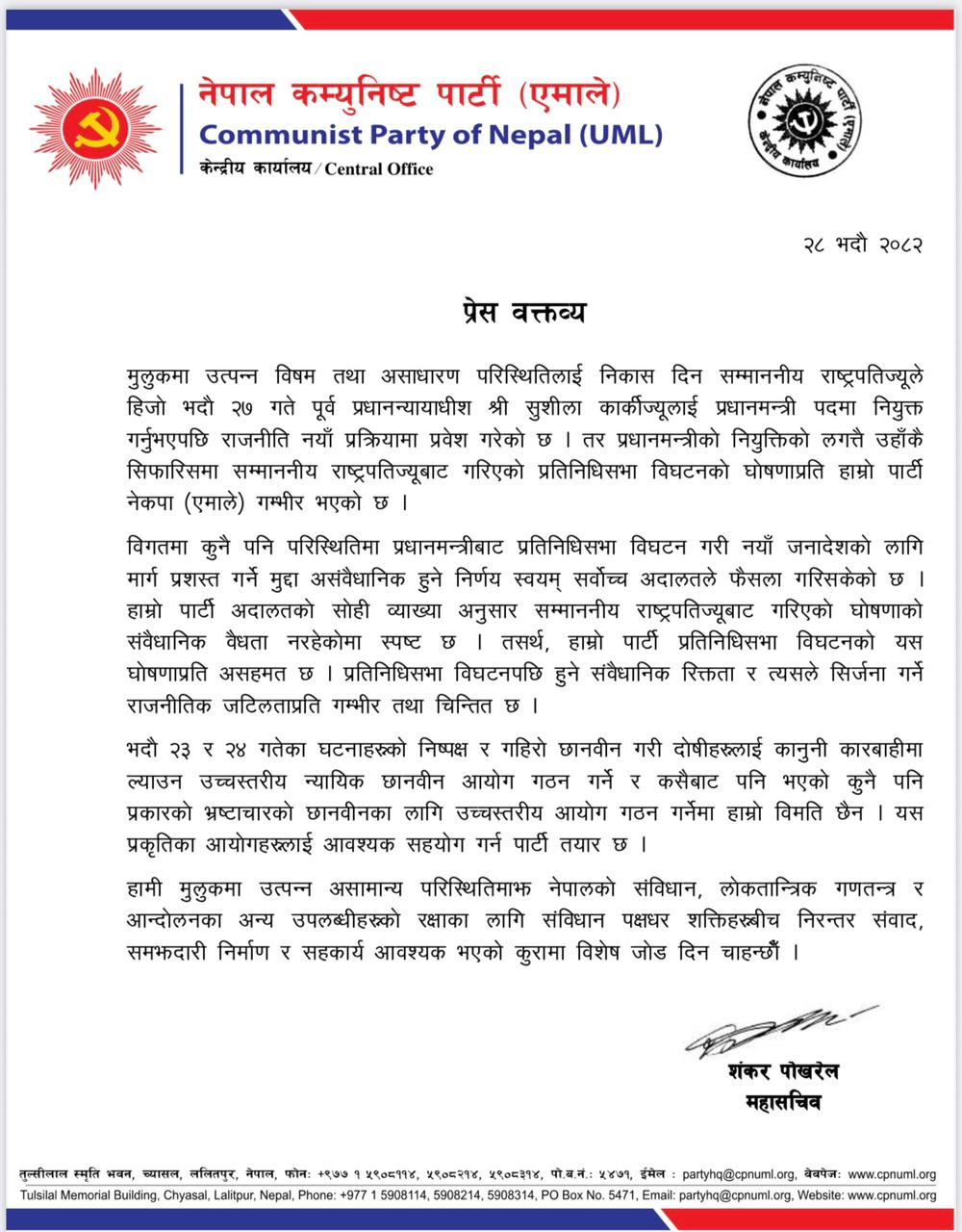 मुलुकमा उत्पन्न विषम तथा असाधारण परिस्थितिलाई निकास दिन सम्माननीय राष्ट्रपतिज्यूले हिजो भदौ २७ गते पूर्व प्रधानन्यायाधीश श्री सुशीला कार्कीज्यूलाई प्रधानमन्त्री पदमा नियुक्त गर्नुभएपछि राजनीति नयाँ प्रक्रियामा प्रवेश गरेको छ । तर प्रधानमन्त्रीको नियुक्तिको लगत्तै उहाँकै सिफारिसमा सम्माननीय राष्ट्रपतिज्यूबाट गरिएको प्रतिनिधिसभा विघटनको घोषणाप्रति हाम्रो पार्टी नेकपा (एमाले) गम्भीर भएको छ ।