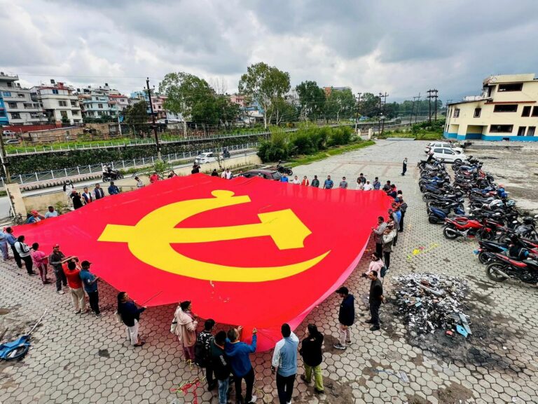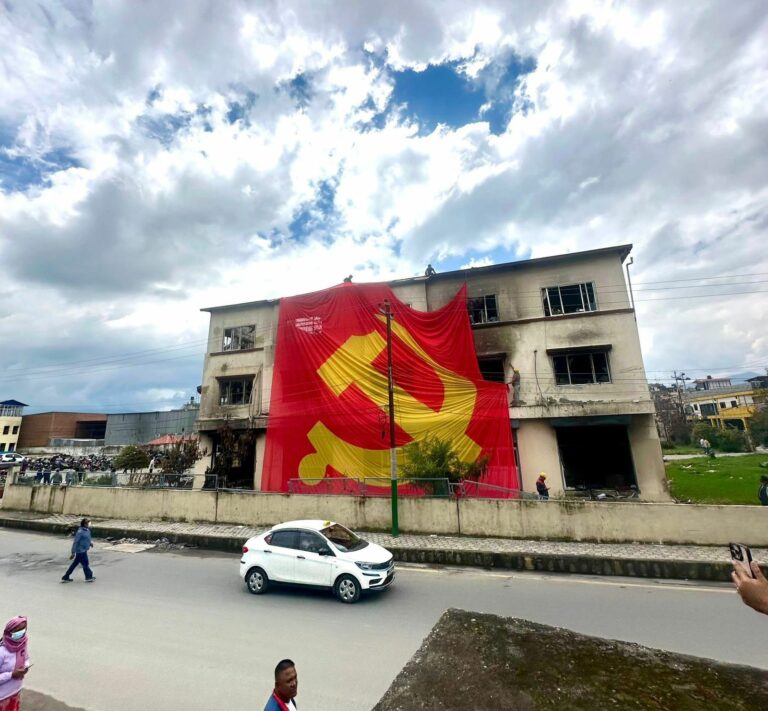 काठमाडौं-जेन–जी आन्दोलनका क्रममा अराजक समूहले तोडफोड गरेको ललितपुरको च्यासलस्थित नेकपा (एमाले) पार्टी कार्यालयमा देशकै सबैभन्दा ठूलो झण्डा फहराइएको छ।