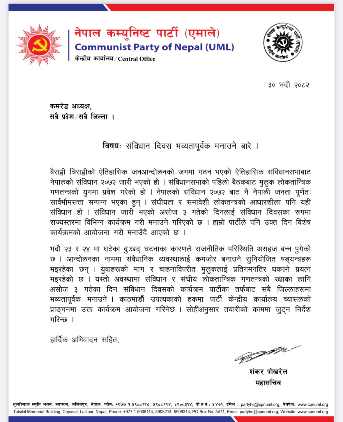 एमाले महासचिव शंकर पोखरेलले २०७२ भदौ ३० गते सोमबार जारी गरेको परिपत्रमा संविधान दिवसका दिन पार्टीका तर्फबाट सबै जिल्लामा कार्यक्रम आयोजना गर्ने र काठमाडौँ उपत्यकामा पार्टी केन्द्रीय कार्यालयको प्राङगनमा ऐतिहासिक उत्सवको रूपमा मनाउन आग्रह गरेको हो।