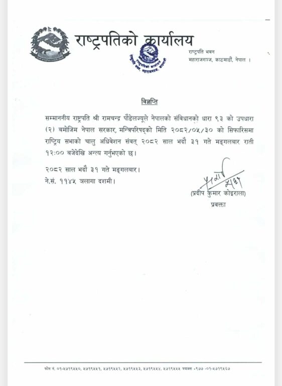 ‘सम्माननीय राष्ट्रपति श्री रामचन्द्र पौडेलज्यूले नेपालको संविधानको धारा ९३ को उपधारा (२) बमोजिम नेपाल सरकार, मन्त्रिपरिषद्को मिति २०८२/०५/३० को सिफारिसमा राष्ट्रिय सभाको चालु अधिवेशन संवत् २०५२ साल भदौ ३१ गते मङ्गलबार राती १२ः०० बजेदेखि अन्त्य गर्नुभएको छ,’ प्रवक्ता प्रदीप कुमार कोइरालाद्वारा हस्ताक्षरित विज्ञप्तिमा भनिएको छ।