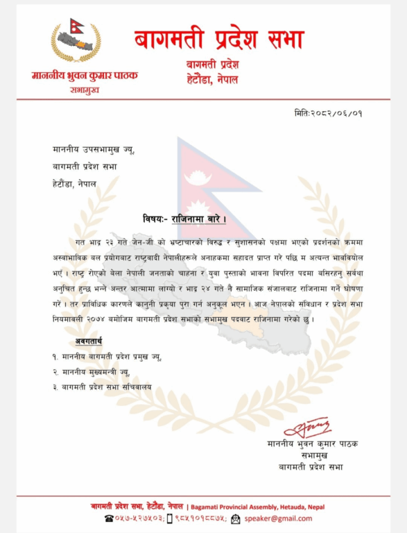 राजीनामा पत्रमा उहाँले उक्त घटनाले आफूलाई अत्यन्त भावविह्वल बनाएको र राष्ट्र शोकमा डुबेको बेला नेपाली जनताको चाहना र युवा पुस्ताको भावना विपरीत पदमा बसिरहनु उचित नलागेको उल्लेख गरेका छन्। उहाँले राजीनामा पत्रको बोधार्थ प्रदेश प्रमुख, मुख्यमन्त्री र प्रदेशसभा सचिवालयलाई पनि दिएका छन्।