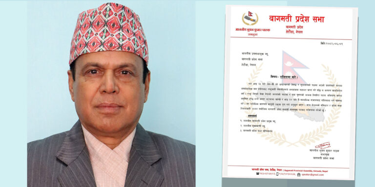 काठमाडौं-बागमती प्रदेशसभाका सभामुख भुवनकुमार पाठकले पदबाट राजीनामा दिनुभएको छ। बुधबार सभामुख पाठकले नेपालको संविधान र प्रदेशसभा नियमावली, २०७४ बमोजिम उपसभामुख अप्सरा चापागाईंसमक्ष आफ्नो राजीनामा बुझाउनु भएको हो।