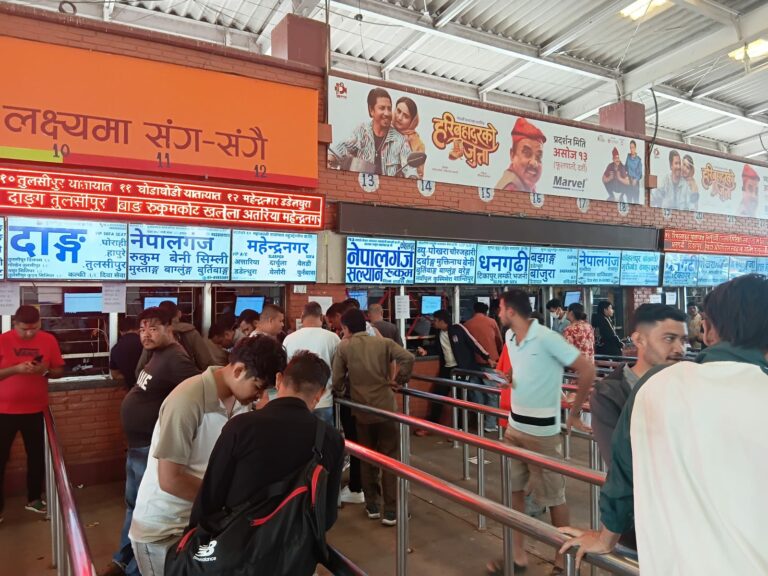 नयाँ बसपार्कमा सञ्चालित लोत्से बहुउदेश्यीय प्रालिका मानव संशाधन प्रमुख पङ्कज मल्लले नयाँ बसपार्कमा यात्रुको घुइँचो बढ्न थालेको बताउनुभयो । उहाँका अनुसार यातायात व्यवस्था विभागमा मङ्गलबार बसेको सरोकार भएका निकायको बैठकले यसवर्ष दसैँका लागि अग्रिम टिकट नखोल्ने निर्णय गरेको छ ।