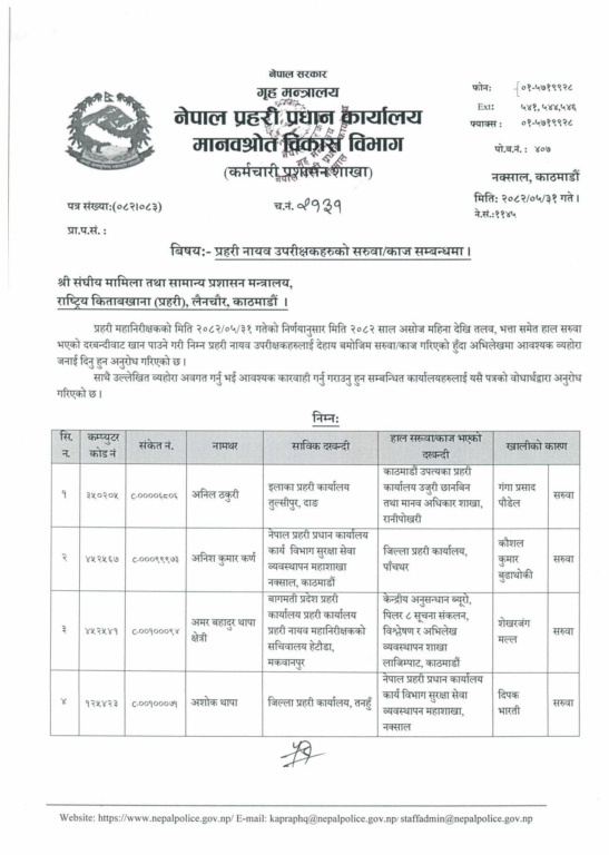 सरुवा हुनेहरूमा काठमाडौँ उपत्यकाका बृत्तसहित विभिन्न कार्यालय र जिल्लाहरू छन्। केही जिल्लामा, इलाकामा र वृत्तमा इन्चार्ज हेरफेर भएका छन्।