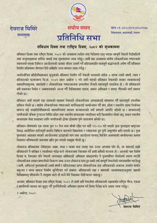संविधान दिवस तथा राष्ट्रिय दिवस, २०८२ को सुखद् अवसरमा स्वदेश तथा विदेशमा रहनुभएका सम्पूर्ण नेपाली दिदीबहिनी तथा दाजुभाइहरूमा बधाई तथा शुभकामना व्यक्त गर्दै उहाँले संविधान घोषणाको एक दशक पुग्न १० दिन बाँकी रहँदा नै गत भदौ २३ र २४ गते भएको जेनजी पुस्ताले गरेको आन्दोलनले मुलतः समाज र राष्ट्रलाई नयाँ सोचका साथै पारदर्शिता र सुशासन दिनुपर्ने महत्त्वपूर्ण चेतना दिएको उल्लेख गर्नुभएको छ। उहाँले भ्रष्टाचार र कुशासन अन्त्यको माग अघि सारेका निर्दोष युवाहरूको विरोधलाई देखाएर देशमा असामान्य स्थितिको सृजना गरिएको र जननिर्वाचित सर्वोच्च विधायिकी संस्थालाई विघटन गर्ने गैरसंवैधानिक कार्य भएको उल्लेख गर्नुभएको छ।