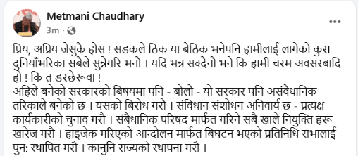 शुक्रबार सामाजिक सञ्जाल फेसबुकमा लेख्दै नेता चौधरीले अहिले बनेको सरकार असंवैधानिक भएकाले यसको विरोध गर्नुपर्ने बताउनु भएको हो।