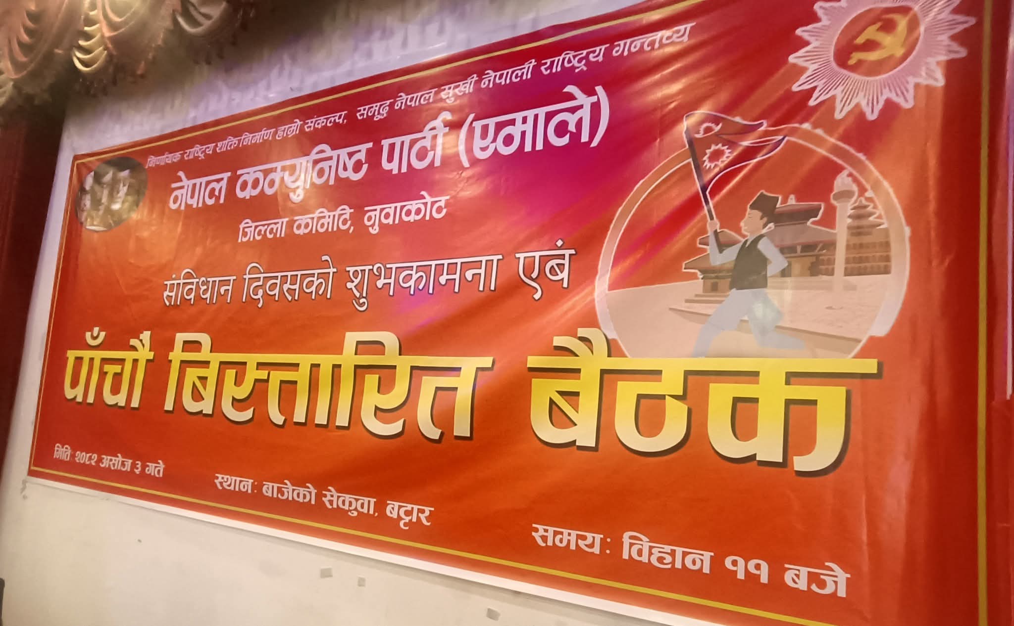 नुवाकोटमा शुक्रबार एमाले जिल्ला कमिटीको विस्तारित बैठकलाई सम्बोधन गर्दै उपमहासचिव ज्ञवालीले संविधानलाई नेपाली जनताको सात दशक लामो संघर्षको दस्तावेज र राष्ट्रिय एकताको सूत्राधार भएको बताउनुभयो। संविधान बनाउँदा आन्तरिक तथा बाह्य दवाव रहे पनि सार्वभौम जनताका प्रतिनिधिमार्फत जारी गर्न सफल भएको स्मरण गर्दै उहाँले भूकम्प र नाकाबन्दी जस्ता चुनौतीपछि पनि नेपाली जनताले संविधानलाई आत्मसात गरेको उल्लेख गर्नुभयो। ‘यो संविधान धेरै प्रगतिशील छ। जारी हुदा तत्कालीन शक्ति सन्तुलनको दस्तावेज पनि हो। यसलाई समयानुकूल परिमार्जन र संशोधन गर्न सकिन्छ,’ उपमहासचिव ज्ञवालीले भन्नुभयो, ‘तर अहिले संविधान नै संकटमा परेको छ। संविधानले नचिनेको सरकारले चुनाव गर्ने भनेको छ, संविधान जोगाउन चुनाव अपरिहार्य हुन्छ।’