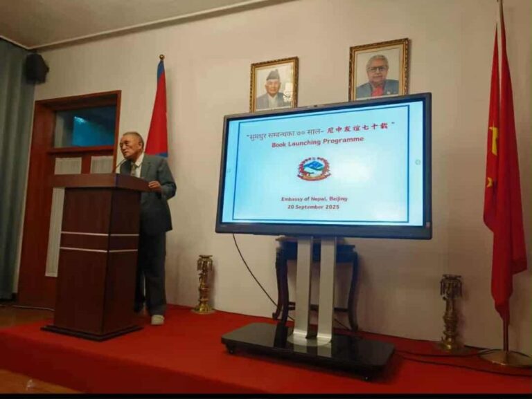 काठमाडौं – नेपाल–चीन मिडिया फोरमद्वारा प्रकाशित ‘सुमधुर सम्बन्धका ७० साल’ बेइजिङमा विमोचन गरिएको छ । आज बेइजिङस्थित नेपाली दूतावासको सभाकक्षमा विमोचन गरिएको उक्त पुस्तक नेपाल र चीनबीचको सम्बन्धमा लिखित दस्ताबेज रहेको मञ्चका अध्यक्ष किशोर श्रेष्ठले जानकारी दिनुभयो ।