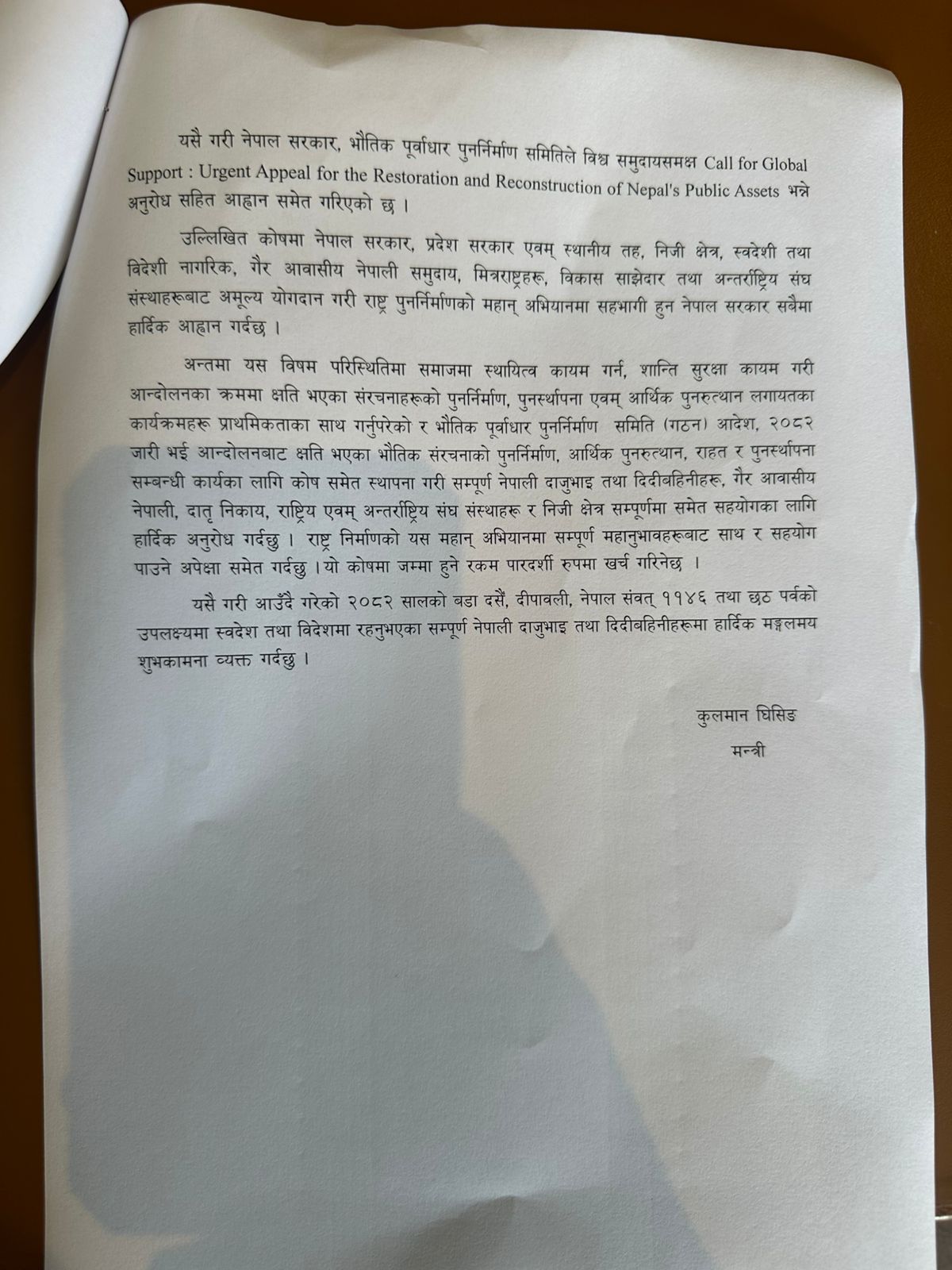 आज पत्रकार सम्मेलन गर्दै मन्त्री घिसिङले राष्ट्रिय पुनर्निर्माण कोषमा आर्थिक सहयोगका लागि अपिल गर्नुभएको हाे।