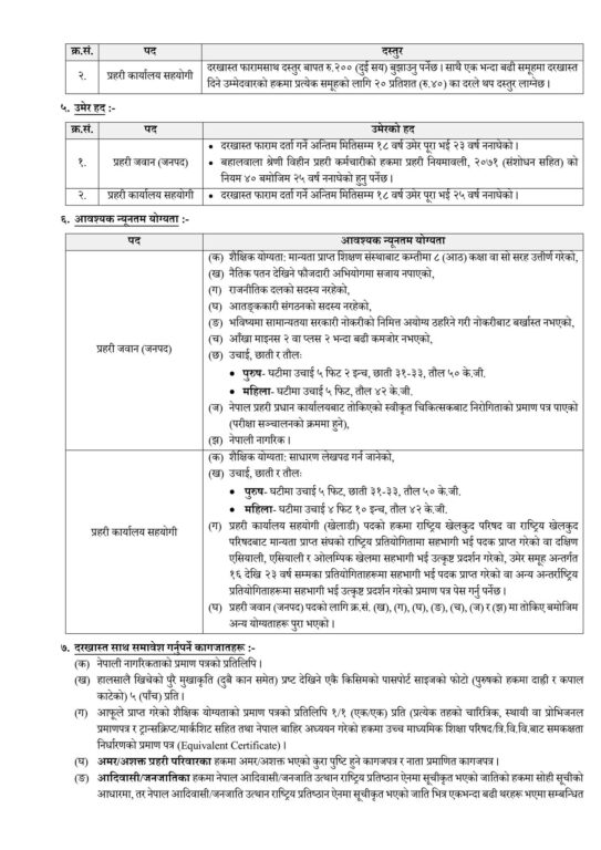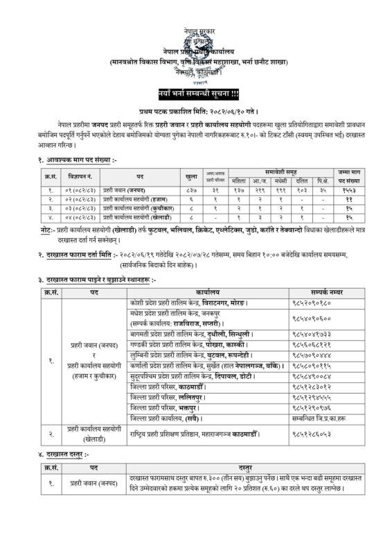 जनपद प्रहरी जवानतर्फ एक हजार पाँचसय ५३, प्रहरी कार्यालय सहयोगी हजाम तर्फ ११, कुचीकारतर्फ १५ र खेलाडीतर्फ १५ पदहरूमा खुला प्रतियोगिताद्वारा समावेशी प्रावधान बमोजिम पदपूर्ति गरिने सूचनामा उल्लेख छ।