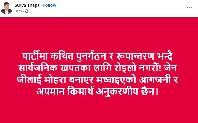 ‘पार्टीमा कथित पुनर्गठन र रूपान्तरण भन्दै सार्वजनिक खपतका लागि रोइलो नगरौं ! जेनजीलाई मोहरा बनाएर मच्चाइएको आगजनी र अपमान किमार्थ अनुकरणीय छैन’, नेता थापाले सामाजिक सञ्जालमा लेख्नुभएकाे छ ।