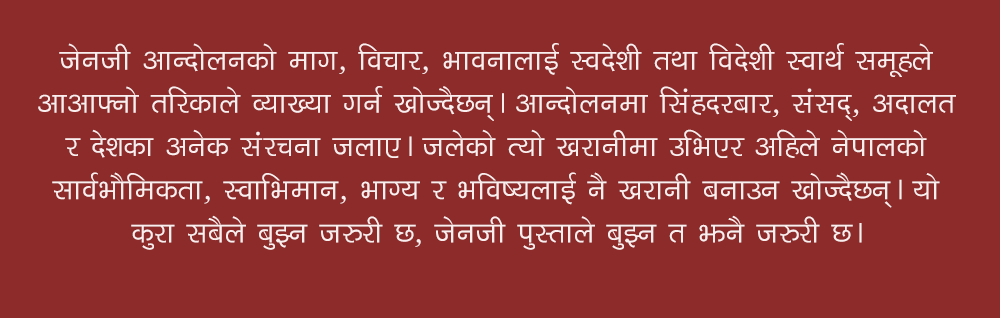 यसरी जेनजी आन्दोलनको माग, विचार, भावनालाई विभिन्न स्वदेशी तथा विदेशी स्वार्थ समूहहरुले आआफ्नो तरिकाले व्याख्या गर्न खोज्दैछन्। आन्दोलनमा सिंहदरबार, संसद्, अदालत र देशका अनेक संरचना जलाए। जलेको त्यो खरानीमा उभिएर अहिले नेपालको सार्वभौमिकता, स्वाभिमान, भाग्य र भविष्यलाई नै खरानी बनाउन खोज्दैछन्। यो कुरा सबैले बुझ्न जरुरी छ, जेनजी पुस्ताले बुझ्न त झनै जरुरी छ।