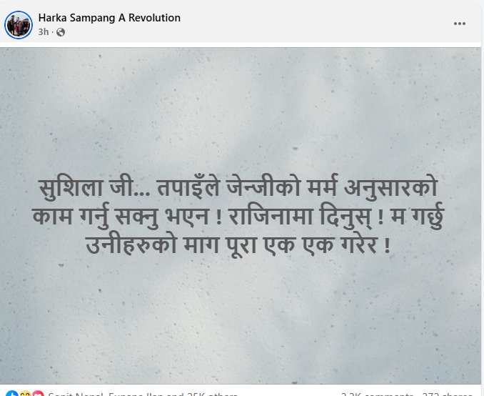‘सुशीला जी… तपाईंले जेन्जीको मर्म अनुसारको काम गर्नु सक्नु भएन ! राजीनामा दिनुस् !’ मेयर साम्पाङले सामाजिक सञ्जालमा लेख्नुभएकाे छ, ‘म गर्छु उनीहरूको माग पूरा एक एक गरेर !’
