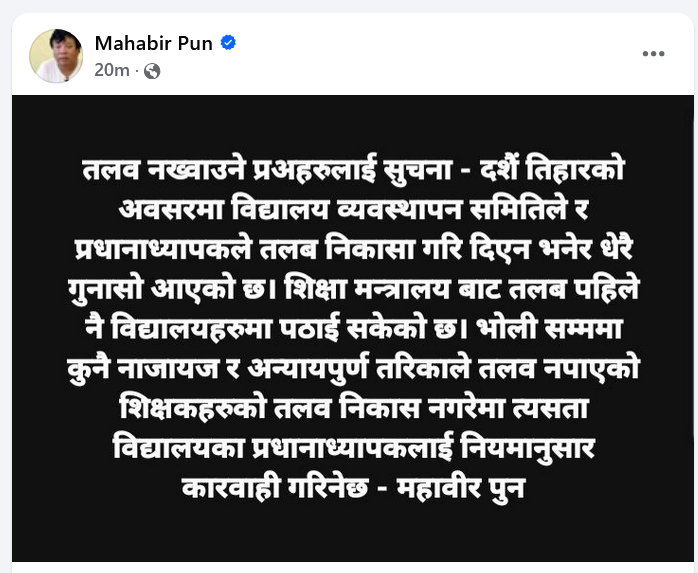 मन्त्री पुनले भन्नुभएकाे छ, ‘तलब नख्वाउने प्रअहरूलाई सूचना- दसैँ-तिहारको अवसरमा विद्यालय व्यवस्थापन समितिले र प्रधानाध्यापकले तलब निकासा गरिदिएन भनेर धेरै गुनासो आएको छ। शिक्षा मन्त्रालयबाट तलब पहिले नै विद्यालयहरूमा पठाइसकेको छ। भोलि सम्ममा कुनै नाजायज र अन्यायपूर्ण तरिकाले तलब नपाएको शिक्षकहरूको तलब निकास नगरेमा त्यस्ता विद्यालयका प्रधानाध्यापकलाई नियमानुसार कारबाही गरिनेछ।’
