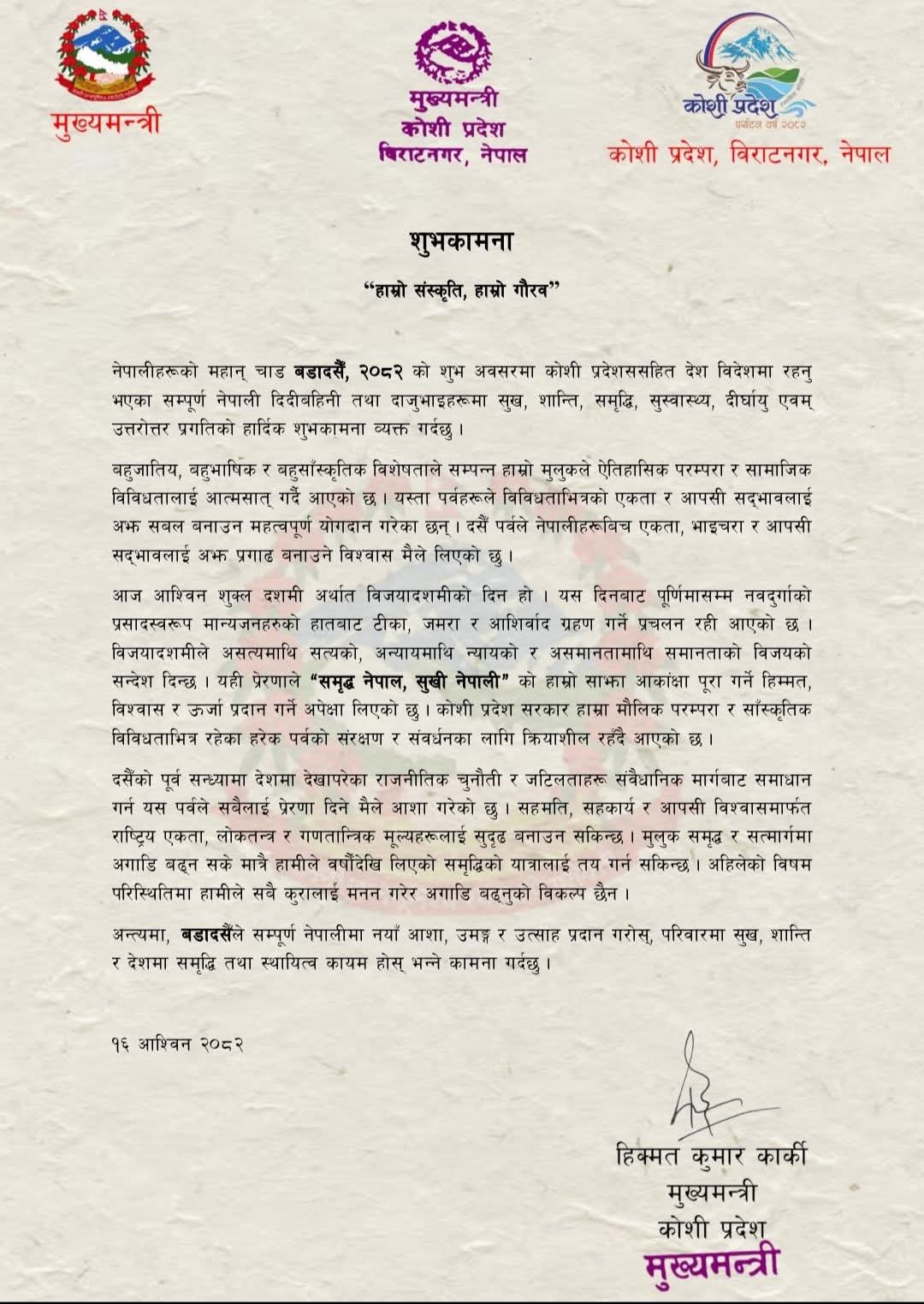 दशैंले नयाँ उमंग, उत्साह र राष्ट्रिय एकतालाई अझ सबल बनाई सबै नेपालीमा आपसी सद्भाव र समृद्धिको मार्ग प्रशस्त गर्ने मुख्यमन्त्री कार्कीको शुभकामनामा बताउनुभएको छ।