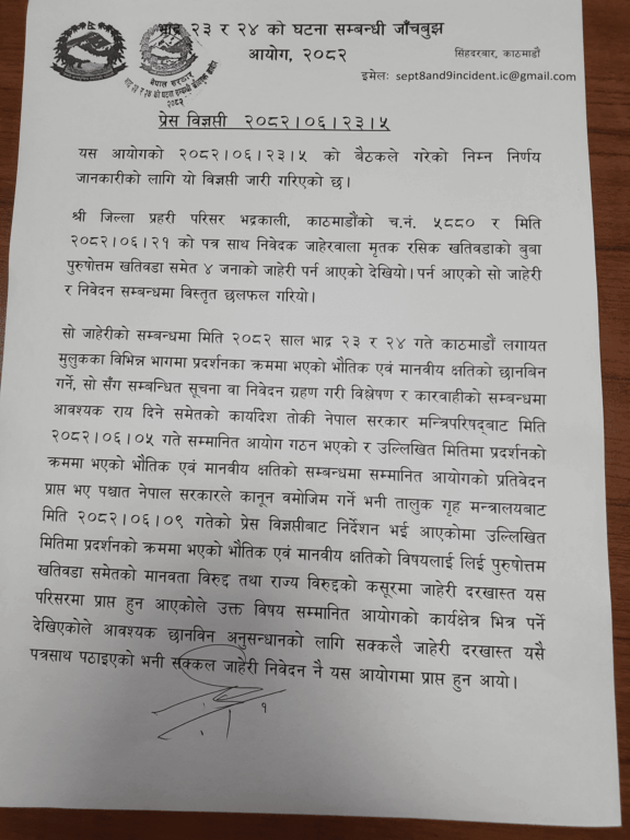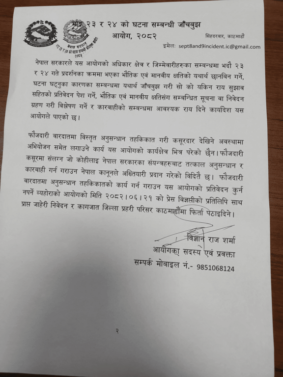 ‘नेपाल सरकारले यस आयोगको अधिकार क्षेत्र र जिम्मेवारीहरूका सम्बन्धमा भदौ २३ र २४ गते प्रदर्शनका क्रममा भएका भौतिक एवं मानवीय क्षतिको यथार्थ छानबिन गर्ने, घटना घट्नुका कारणका सम्बन्धमा यथार्थ जाँचबुझ गरी सो को यकिन राय सुझाव सहितको प्रतिवेदन पेस गर्ने, भौतिक एवं मानवीय क्षतिसँग सम्बन्धित सूचना वा निवेदन ग्रहण गरी विश्लेषण गर्ने र कारबाहीको सम्बन्धमा आवश्यक राय दिने कार्यादेश यस आयोगले पाएको छ,’जारी विज्ञप्तिमा भनिएको छ ।
